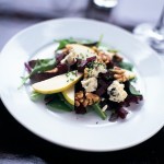 U maloj zdjeli pomiješajte kruške s 2 žlice slatkog vrhnja. U drugoj zdjeli pomiješajte preostalo slatko vrhnje, gorgonzolu, ocat, sol i papar. Dodajte nasjeckani vlasac. U velikoj zdjeli pomiješajte zelenu salatu, crveni radič, potočarku i krastavce.
