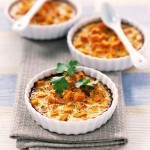 U lim (veličine 30 x 20 cm) stavite papir za pečenje koji ste namazali maslacem. Na preostalom maslacu popržite češnjak, crvenu papriku i rajčicu te pirjajte oko 5 minuta. Dodajte i mrkvu te pirjajte dok ne omekša.